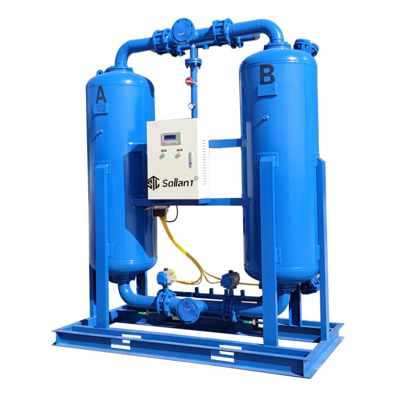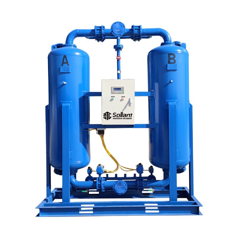 Micro-heat regenerative adsorption dryer is based on the heatless adsorption dryer, adding a heater, by increasing the temperature of the regeneration airflow, increasing the capacity of the regeneration airflow to water vapor, and increasing the temperature of the adsorbent to make the surface of the adsorbent Enhanced activity and easier regeneration. Through the above two aspects, while improving the regeneration effect, it can also reduce the regeneration air consumption, so as to achieve the purpose of saving compressed air and energy